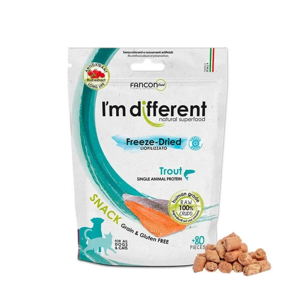 Jsem different Snack Trout Lyofilizovaná svačinka Pstruh 40 g. Lyofilizované pochoutky jsou stále častějším výběrem vědomých chovatelů psů a koček. Tato nízkokalorická, monoproteinová svačinka představuje skvělou alternativu k tučným příchutím obsahujícím umělé konzervační látky a barviva. …