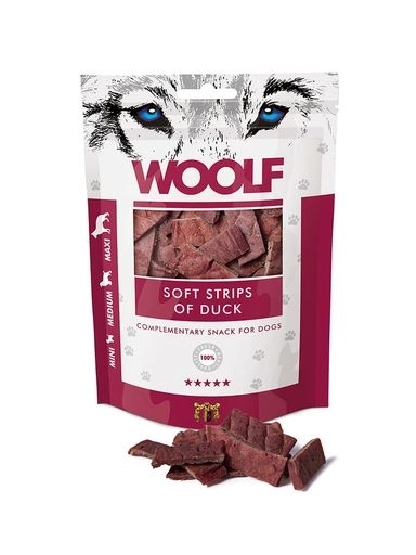 WOOLF SOFT STRIPES KACHNA 100 g. Vyrobeno ze 100% vysoce kvalitních surovin. Vyrobeno a baleno bez konzervantů, chemických přísad nebo barviv. Složení: Kachní maso 90%, glycerin, škrob. Analytické složky: Surová bílkovina 45%, vlhkost 20%, hrubý tuk…