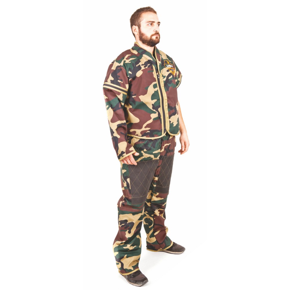 SUPER LEHKÉ OBLEČENÍ PRO POSLUHOVÉHO MANÉVRA Z RIP-STOP LÁTKY, BARVA LESNÍ MASKÁČ – BUNDAS01032VELIKOST : MVýška 164-170 cmTloušťka 0,8 cmHmotnost 0,7 kgBunda pro poslušného manévra je součástí lehkého oblečení z rip-stopu určeného pro trénink IGP. Použitý materiál je polyesterovo-bavlněná tkanina (65 % Pes; 35 % Bw), která je zesílena přidáním silnějšího vlákna v pravidelných intervalech, které zabraňuje roztržení. Barva materiálu lesní maskáč se používá k šití vojenských uniforem. Bunda je vybavena jedním rukávem (připínatelným na zip a dobře zajištěným), který lze připnout na levou nebo pravou ruku podle potřeby.Bunda je k dispozici ve čtyřech velikostech: M, L, XL, XXL.Ručně vyrobeno pro Dingo Gear ve výrobním závodě „Dingo” Sp. z o.o. Polsko.Je možné si oblečení personalizovat (vyšívka libovolného loga na zádech bundy) v ceně oblečení. Dodací lhůta oblečení je tři týdny po dodání souboru s grafickým návrhem.Charakteristika bundy:rip-stopzapínání na zip YKK, který zaručuje odolnost zapínánílímec – stojáčekokraje bundy zakončené bavlněnou lemovkoupodšívka zevnitř vyplněná pěnou tlumící nárazy psavšechna zakončení mají dvojité švyneomezuje v pohybu poslušného manévra, takže může efektivněji pracovat se psemlze prát při teplotě 30 stupňů CelsiaBunda má odnímatelný rukáv, který lze připnout na libovolnou stranu.Bunda pro poslušného manévra byla vyrobena ručně s ohledem na nejmenší detaily, aby uživatelé získali větší ochranu během cvičení. Podívejte se také na super lehké oblečení z rip-stopu – kalhoty.